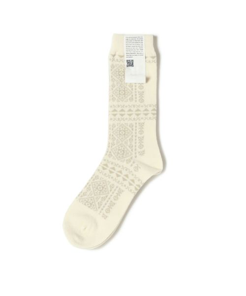 【デザイン】MARCOMONDE(マルコモンド)のソックス。2025年秋冬コレクションのテーマ“Turkey”から着想を得た一足で、フレスコ画を思わせる繊細な模様が印象的。旅先で出会った文化や町並み、色彩を閉じ込めたようなデザインは、足元からコーディネートに深みを与えてくれます。シンプルなスタイルのアクセントとしてはもちろん、スカートやクロップドパンツから柄を覗かせるコーディネートもおすすめです。
