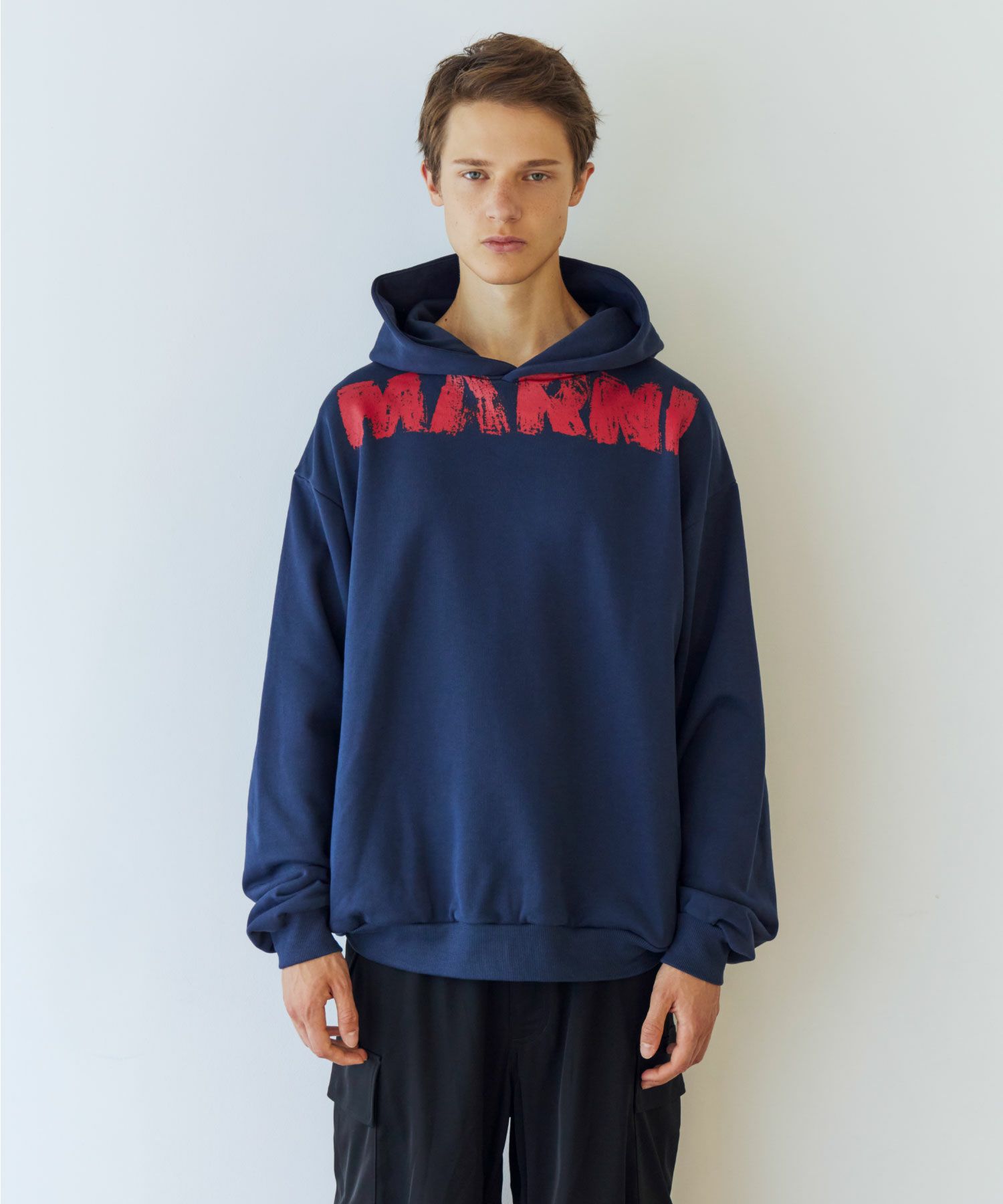 【デザイン】MARNI(マルニ)のフーディー。 袖口と裾にリブを配したオーバーサイズのフーディーに、ハケで描いたようなブランドロゴのプリントが施されており、手仕事のようなクラフト感が漂います。MARNIらしい個性光る一着です。