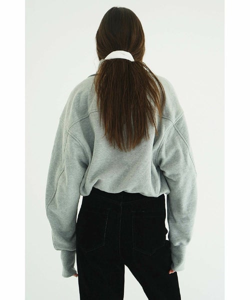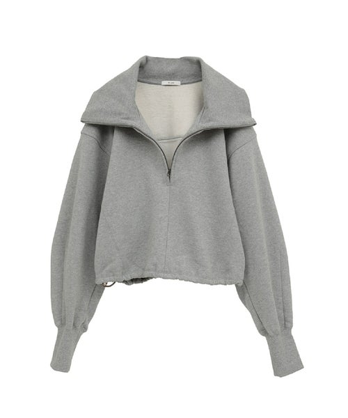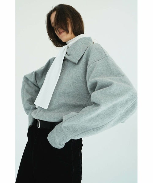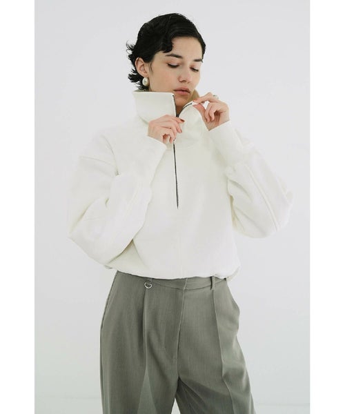 【デザイン】 CLANEのスウェットのプルオーバー。ハーフジップのデザインなのでレイヤードさせて抜きのある印象にもなります。ファスナーを閉めると首元のネックラインが長くマフラー要らずでお召し出来ます。適度なフィット感がありながらも締め付けすぎず快適な着用感を叶え、肌寒い季節にも頼れる存在。裏起毛のデザインが気持ちよく、裾はドロストできるデザインになっています。