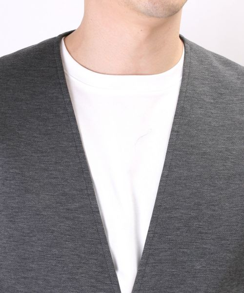 【デザイン】 ミニマルなノーカラージャケット。カーディガンのような気軽さで羽織れるライトな一枚となっています。ホームケアが可能なのも嬉しいポイント。