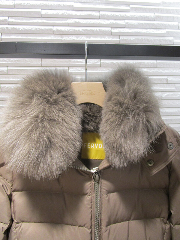 フードなしのすっきりとした首元へフォックスファーをあしらったクラス感のある一着。