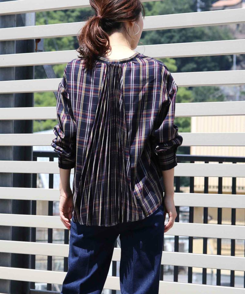 バックスタイルはチェック柄のプリーツが折り重なり、印象的です。