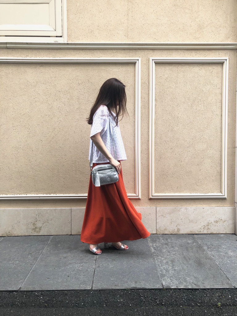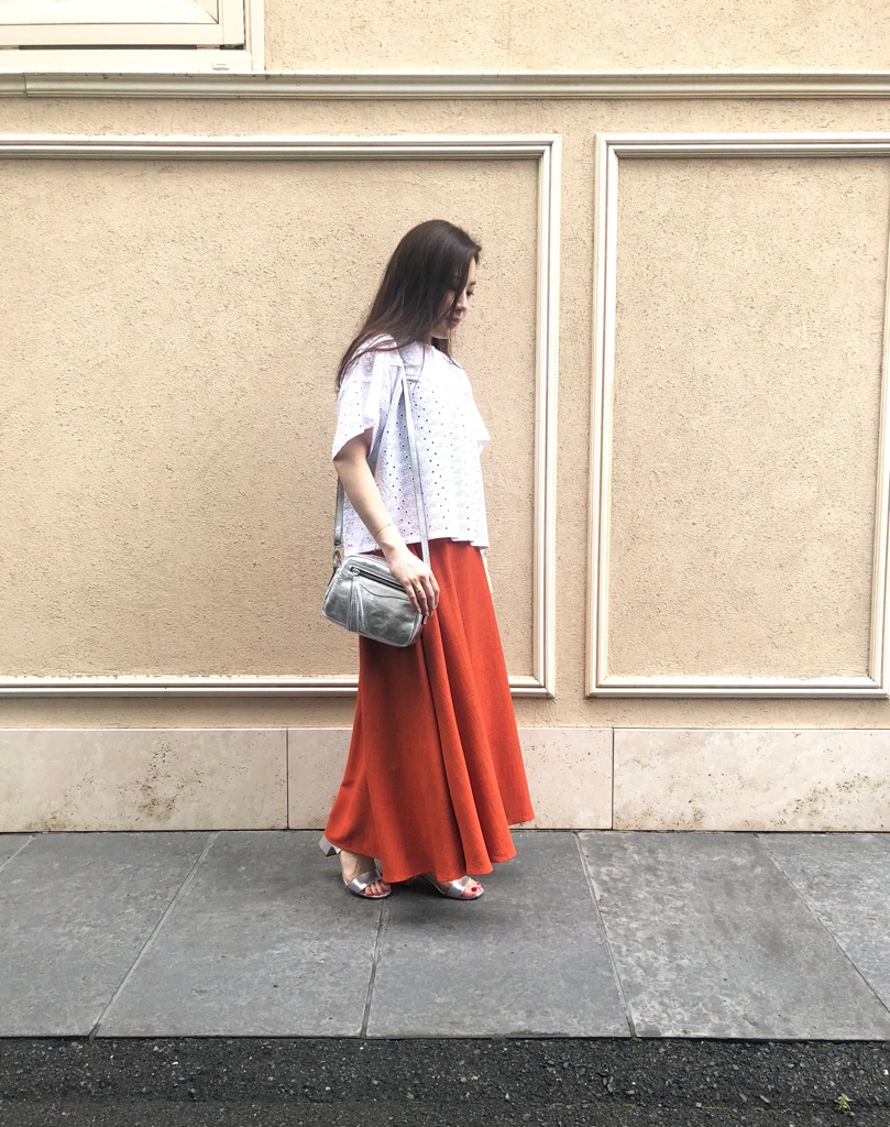 目を惹くオレンジカラーが華やかなロングスカートと合わせたコーディネートはこちら!!