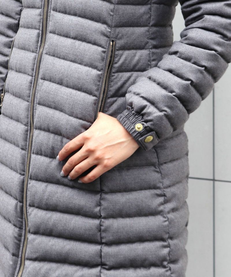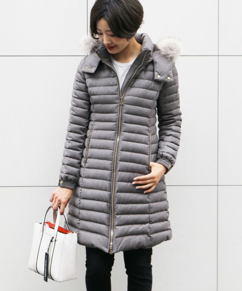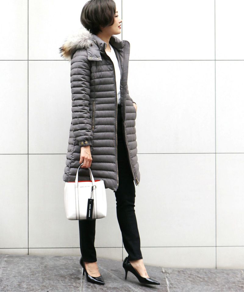 ボリュームのあるラクーンファーは取り外しが可能ですステッチの幅を狭くし、ボリュームを抑えることで重くなりがちなロング丈をスッキリとした美ラインに仕上げています。