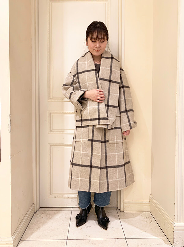 ボリュームのある同布のスカーフ付きで、巻くと、違った雰囲気を楽しんでいただけます。