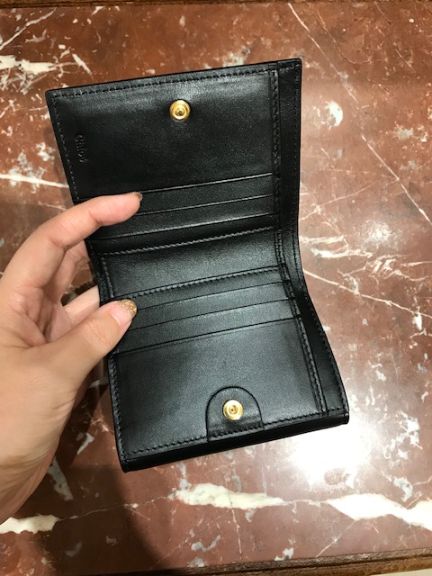 上質なスムースカーフスキンと、フラップについたクロエのロゴのCのパーツが特徴のお財布です。