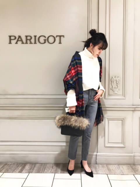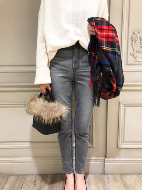 また、甘くなりがちなチェックスカートもカジュアルダウンと合わせれば甘くなりすぎず、大人かわいいスタイルが完成します。