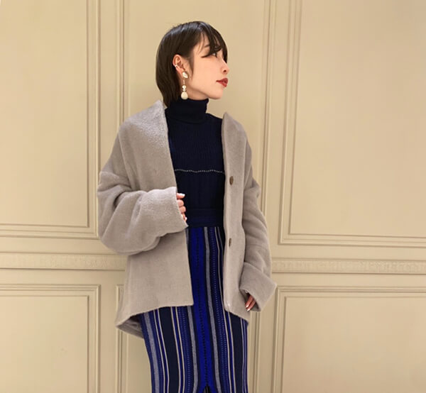 バージンウールの柔らかな風合いと、優しく身体を包み込んでくれるシルエットは、1度袖を通すと癖になる一着ですよ。