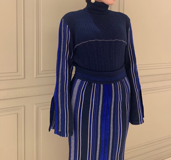立体感のある糸を使用し様々な編み地をミックスさせたストライプ柄ニットは、同じ生地のスカートもあるため、セットアップもおすすめですよ。
