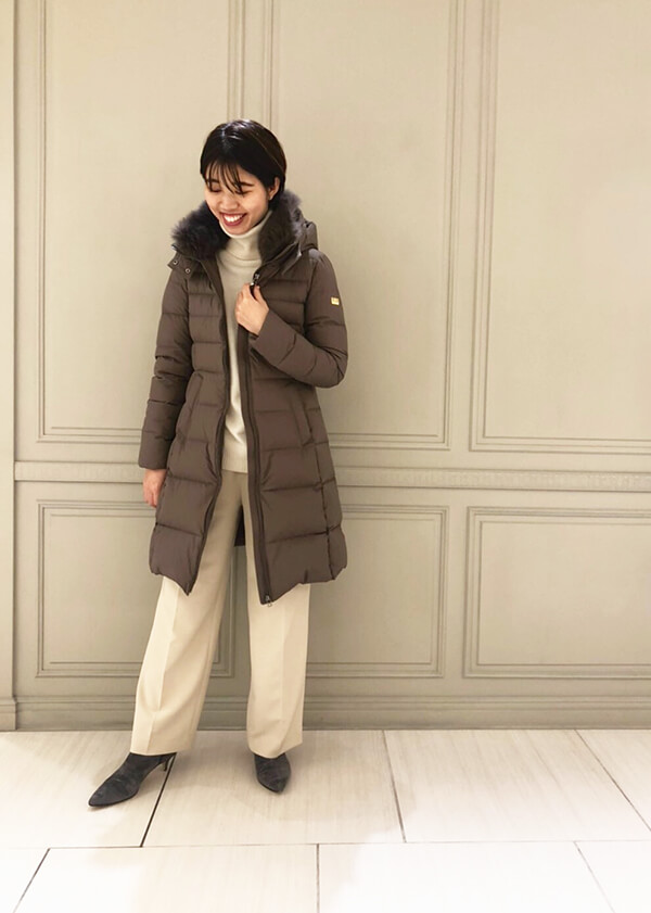 ダウンで冬エレガントを作るにはシルエットに拘ることが重要。