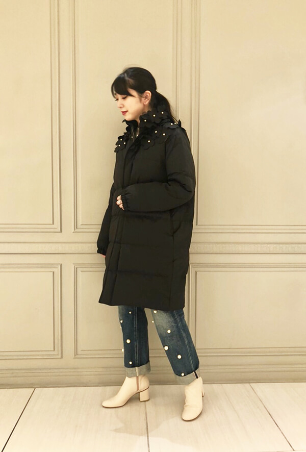 襟元に散りばめられたお花モチーフがアクセントとなり、シックにまとまりがちな黒のダウンを、トレゾアらしい大人の遊び心を取り入れた一着です。