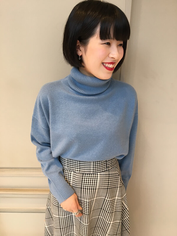 ウインターさんの肌によく映えるダスティーブルーのカシミアニット。