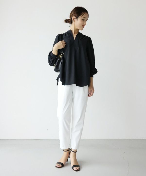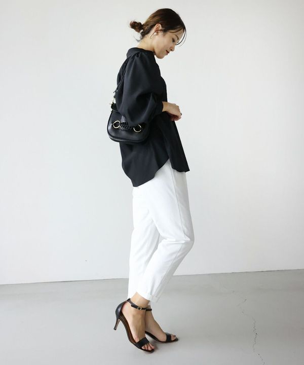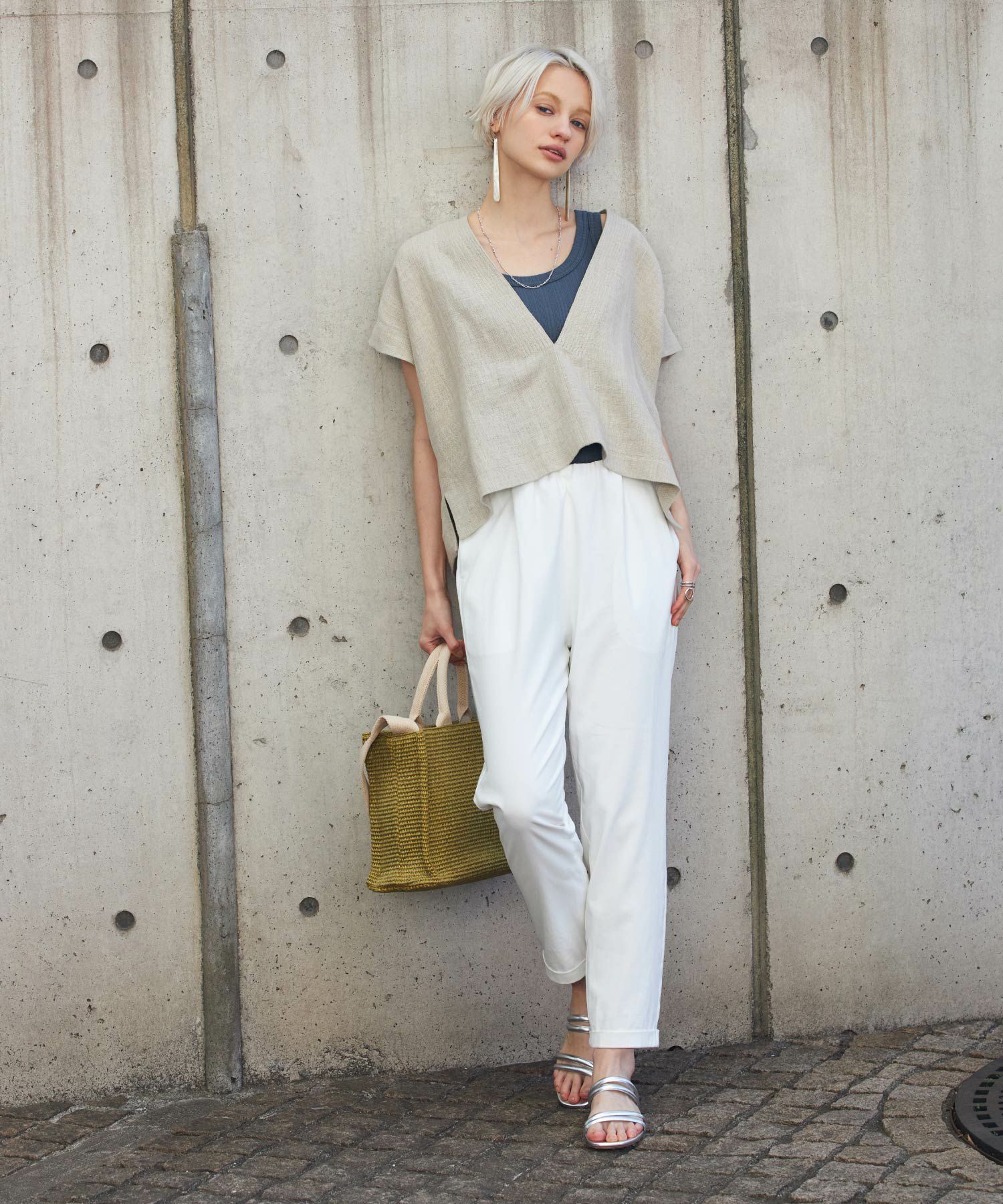 重くなりがちな暗めカラーのトップスにも、リネン混のホワイトを合わせるだけで一気に季節感をプラスできます。