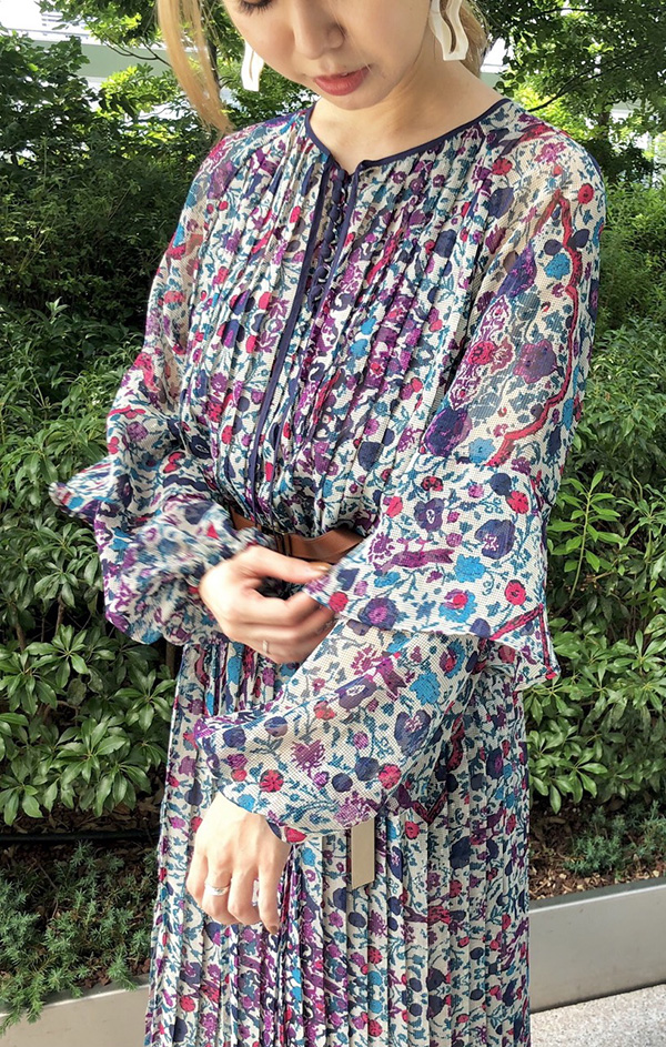 “ペルシャ絨毯”が着想源になったワンピース。ウエストマークし女性らしいラインを演出してみました。
