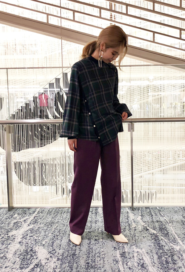 大人な雰囲気のチェック柄には、スパイスの効いたパープルでアクセントを取り入れてみました!