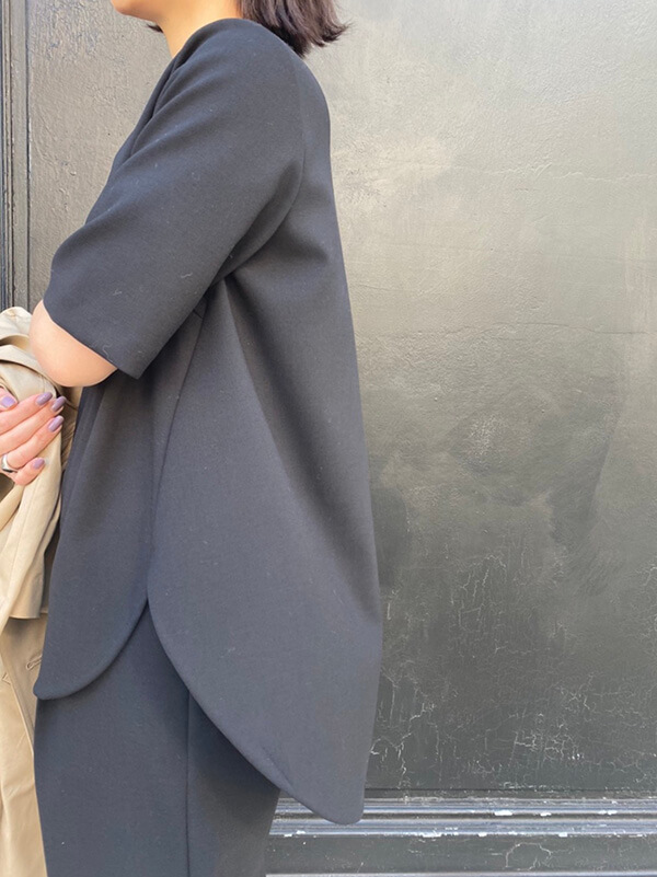 トップスはセットインスリーブでコンパクトに纏まりながら、裾にかけて立体的な広がりが、バックシルエットも綺麗です。