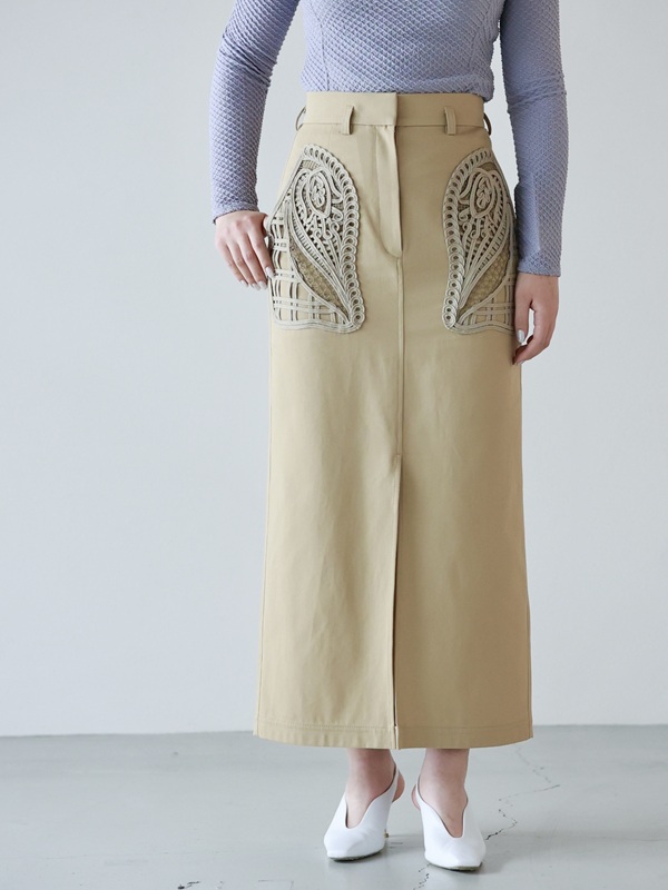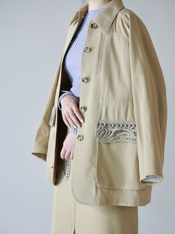 ポケットの繊細な刺繍装飾で一気にマメの世界観に。日常着の中に、静かに美意識を忍ばせた1着です。初めてマメを着る方にもチャレンジしやすいアイテムだと思います。