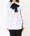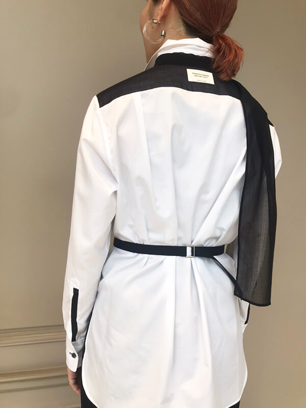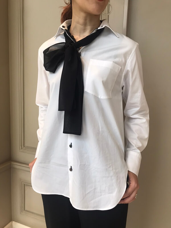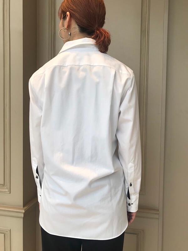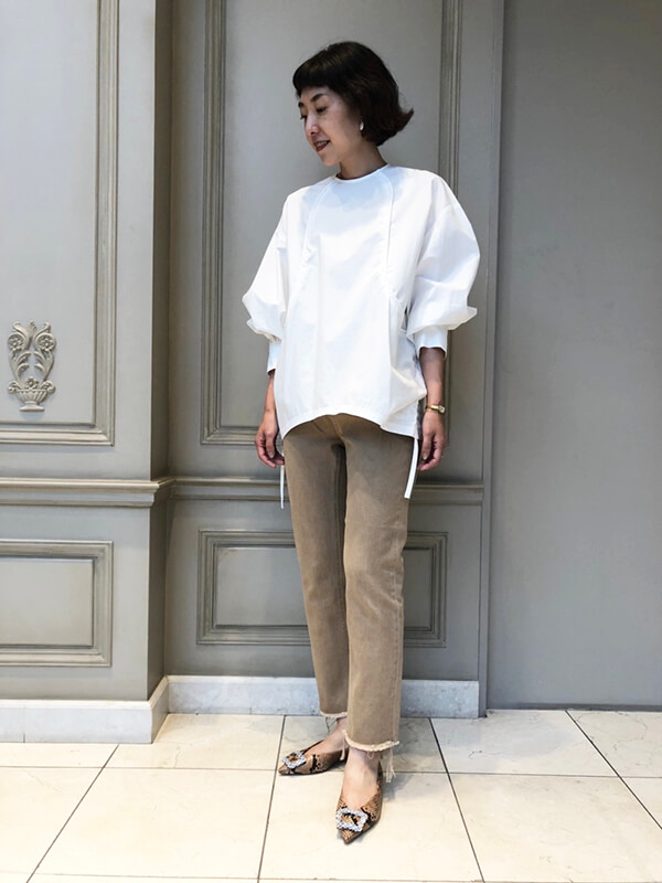 合わせたのは、コットン100%のバルーンブラウス。着用するとふわりと広がるバルーンシルエットが女性らしいブラウスです。フロントデザイン、サイドのドロストデザインなど、シンプルながらもミュラーらしさが散りばめられています。程よく張り感のある生地により、贅沢なシルエットが堪能できます。