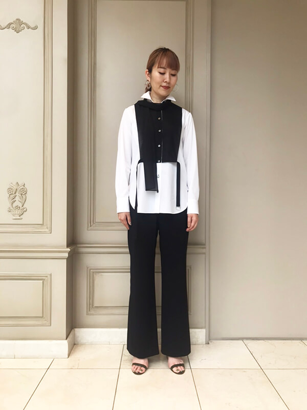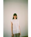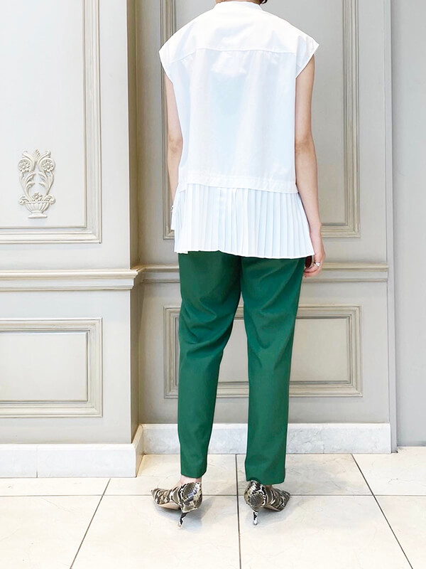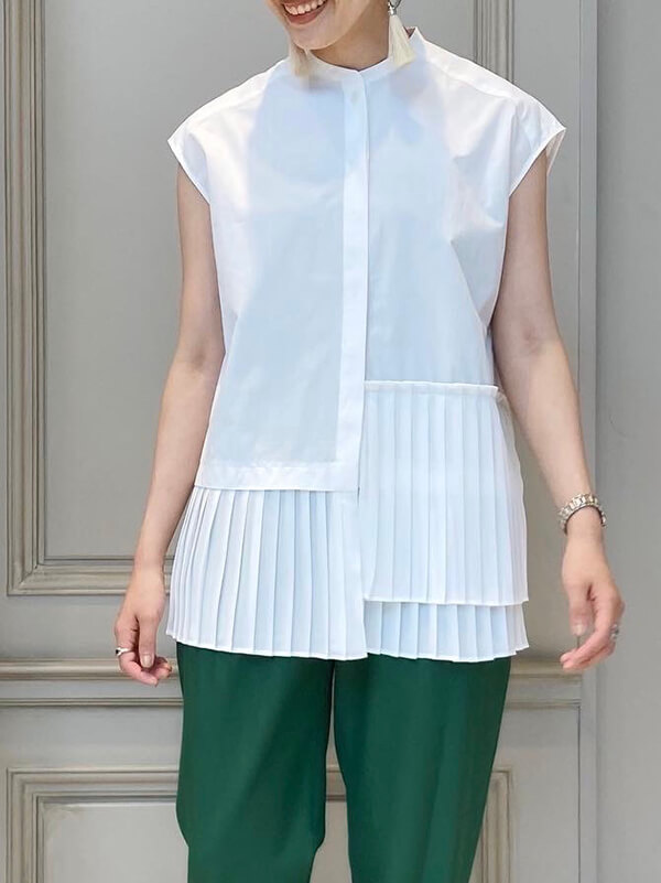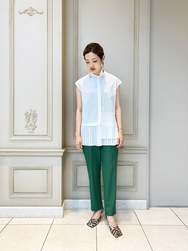 合わせたのは、クラネのアシンメトリーなプリーツがデザインポイントのノースリーブシャツ。ノースリーブなので真夏日にもぴったりで、やや肩にかかる袖のデザインは腕をシャープに見せてくれます。身頃はハリのある布帛のシャツ地に、シフォンの柔らかいプリーツが施され素材の変化が楽しめる1枚です。