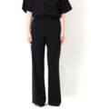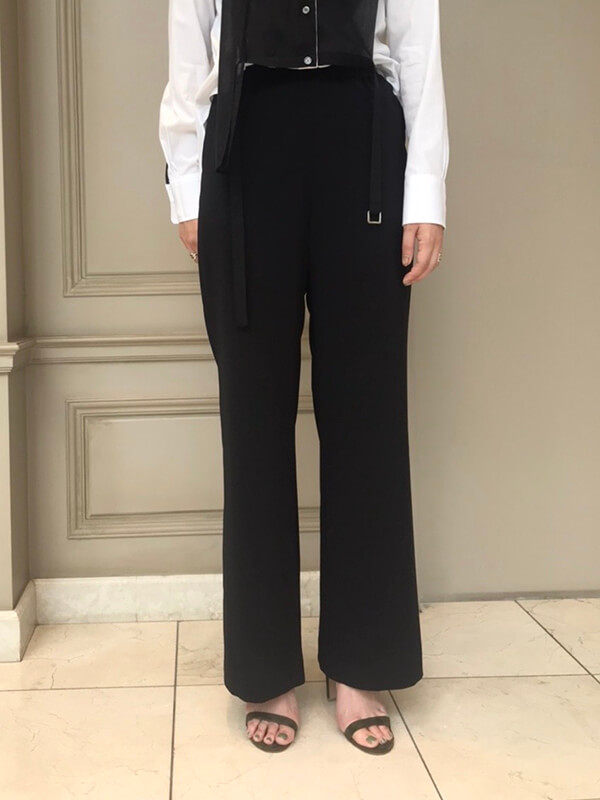 こちらは、ハイウエストでレッグラインを綺麗に見せてくれるワイドパンツ。ポリエステルのストレッチ素材で、ドライタッチのさらりとした生地に、ウエストゴム仕様で穿き心地も抜群。ウエストゴムで気楽に履けるけれど、シルエットもいつもうっとりするほどの綺麗さです!