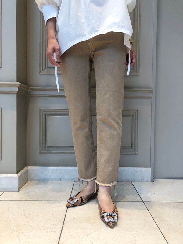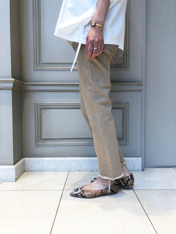 kaneko:20SSから人気のエクリュカラーに続き20AWはさらに絶妙なニュアンスカラーのバリエーションが増えました!砂や土、石といった自然界に存在するナチュラルカラーを題材に絶妙な褪色を表現する硫化染めであたりをつけることで絶妙な、風合いが楽しめます。リラックス感と洗練さを同時に叶えてくれる、そんな1本です。