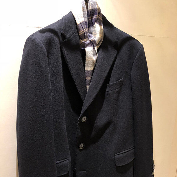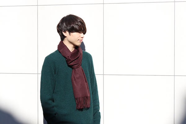 恐らく多くの男性の方がもたれているであろう、ブラックやネイビーといった暗い色のアウターも、このマフラーをプラスするだけで今季っぽい明るい印象になります。
