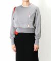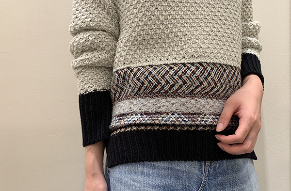 様々な素材や編み地、パーツをコラージュしたニットのプルオーバー。