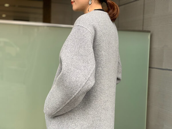 なぜ私でも着れるかというと、このコートは身幅が細くすっきりとしたシルエットになっているからなんです。