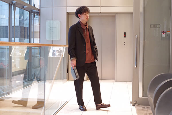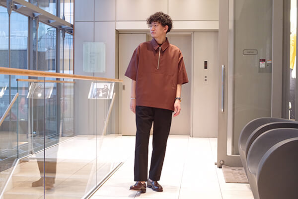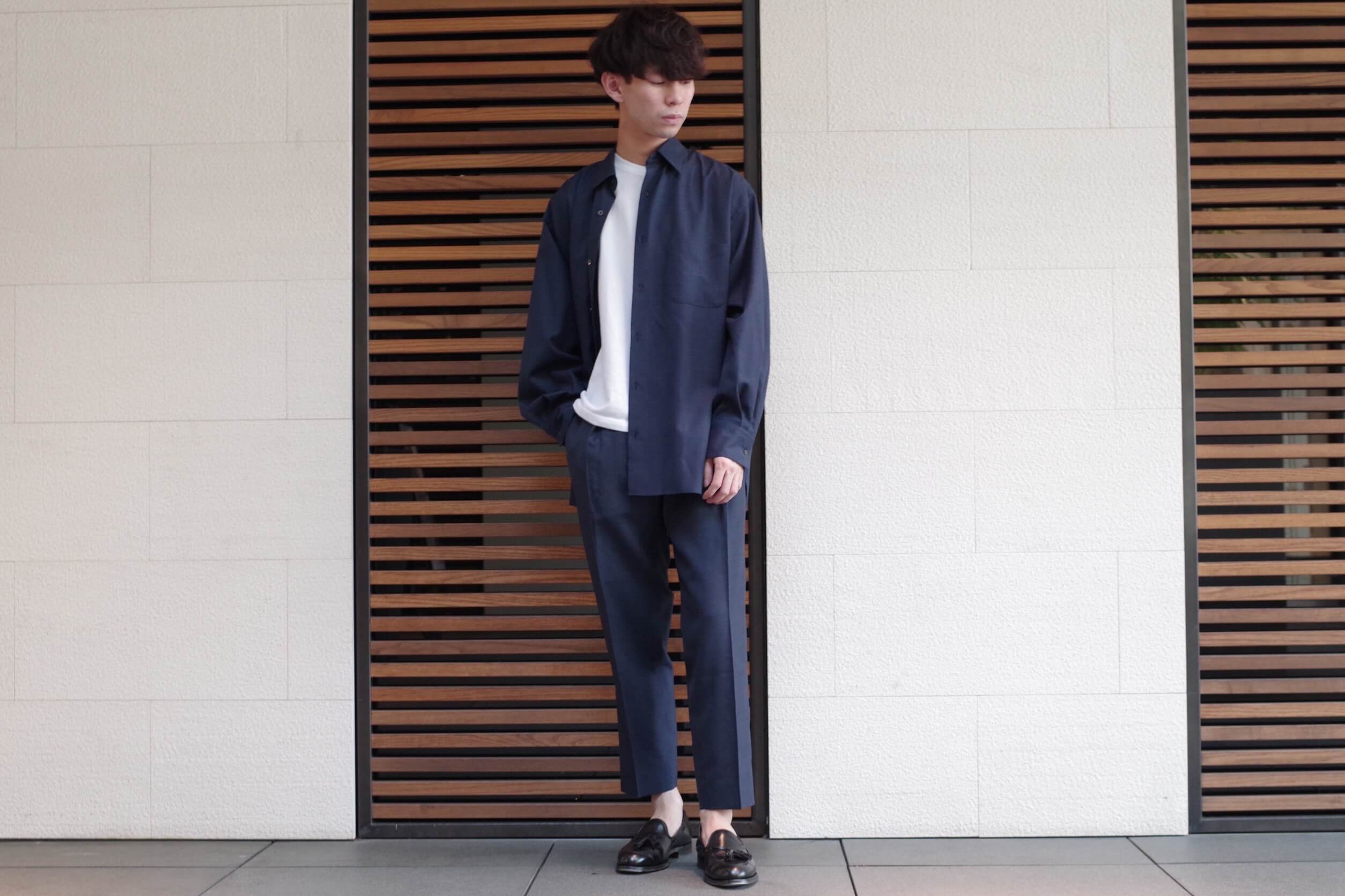 こちらはシャツとパンツがセットアップで着ることができる仕様で、ネイビーの色味が大人で洗練された雰囲気を出しつつも、ジャケットのセットアップではない、シャツの少し緩いサイジングがカチッとさせず決まりすぎないところがオシャレです。