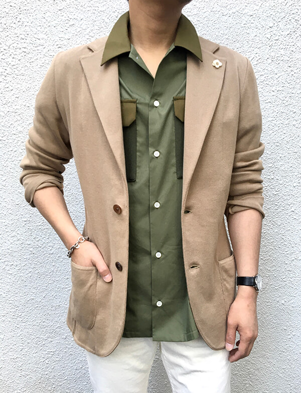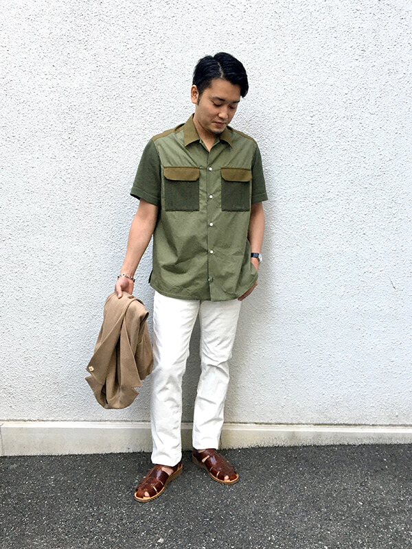 また、カーキのシャツには、ベージュやホワイトなどを合わせ、コロニアルカラーでコーディネートして頂くと、さらに今年らしい着こなしになります。