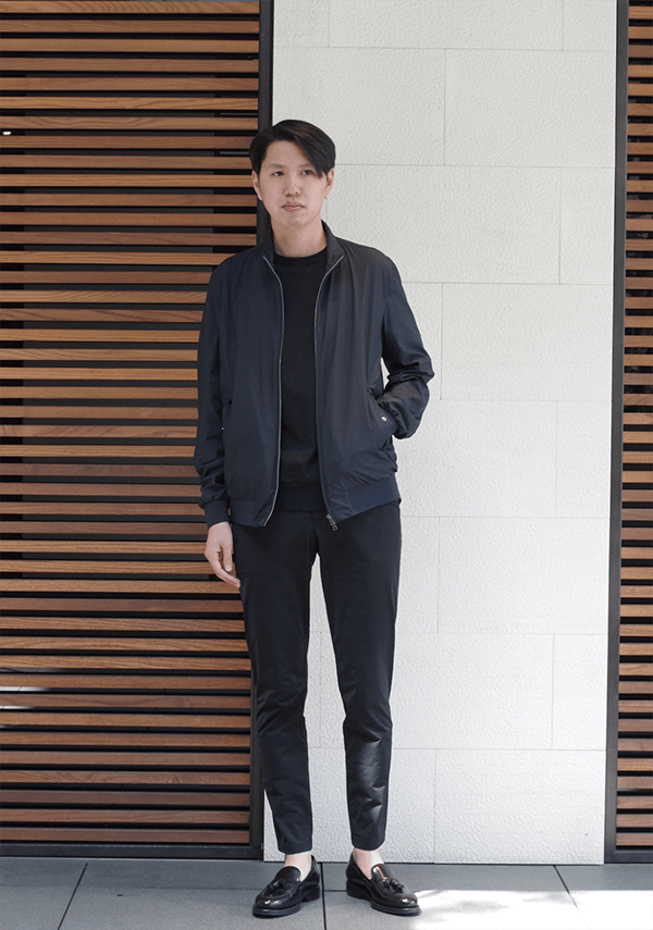 ルノのタイトなライトブルゾンにガラスレザーのタッセルローファーを合わすことで、アダルトなカジュアルスタイルに仕上げました。