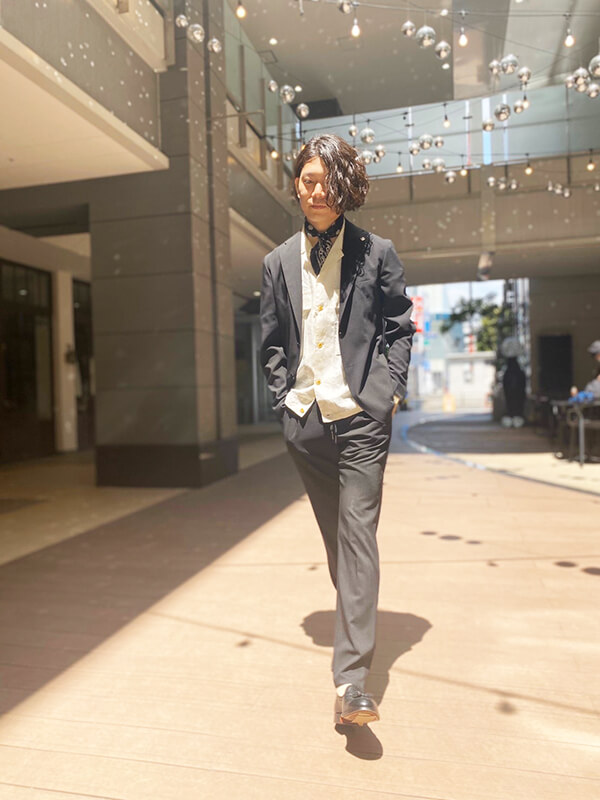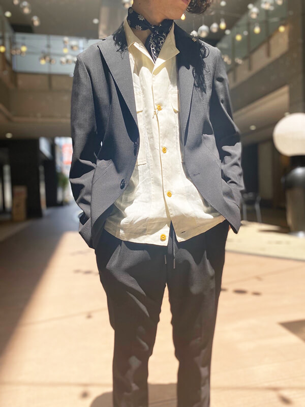 タリアトーレのイージースーツをセットアップに見立てたスタイリング。