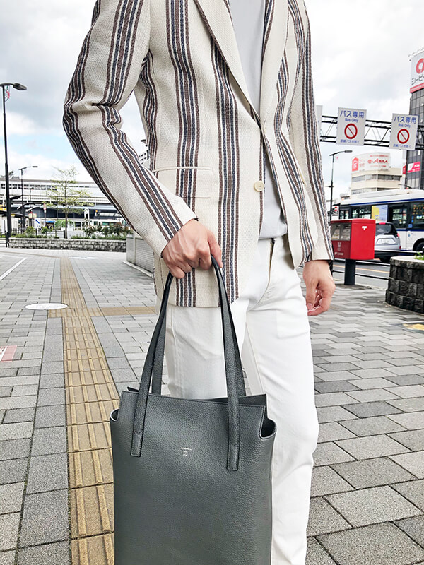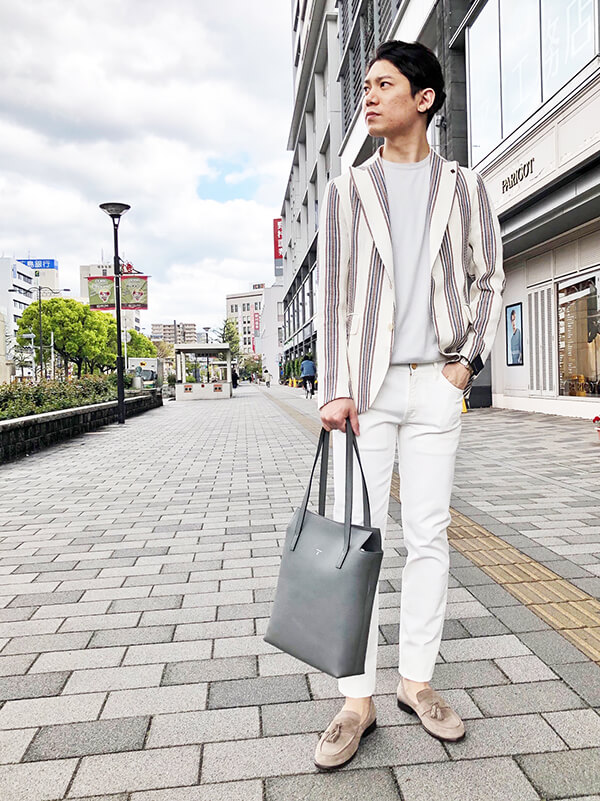 ブラックアイテムを1点も使わずにカッチリ感を演出します。