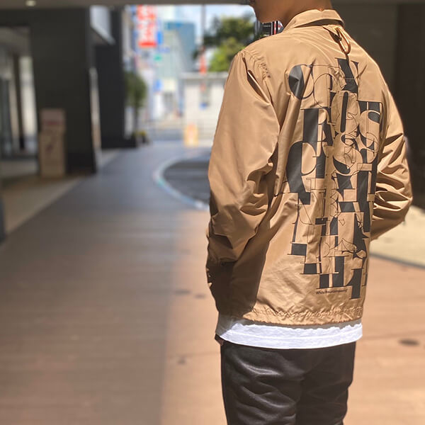 バックプリントが施されたインパクトのあるコーチジャケットなので、羽織るだけで様になりますね。
