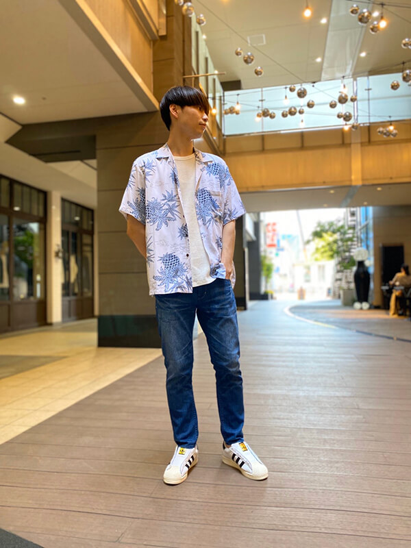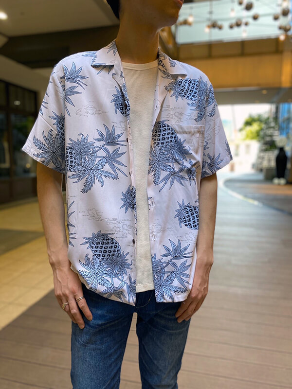 見え方はシンプルなのでアロハシャツ等、羽織ものと合わせるとより凹凸の素材感が分かりやすくおススメです。