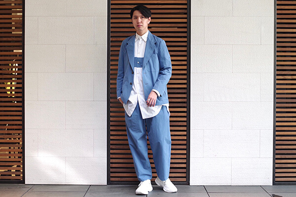 まずは今シーズンらしい清涼感のあるルーズセットアップ。