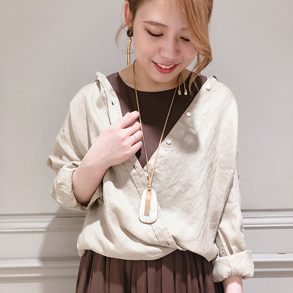 こちらのリネンシャツは裾サイドにボタンが付いておりカシュクールシャツとしてもお召しいただけます。