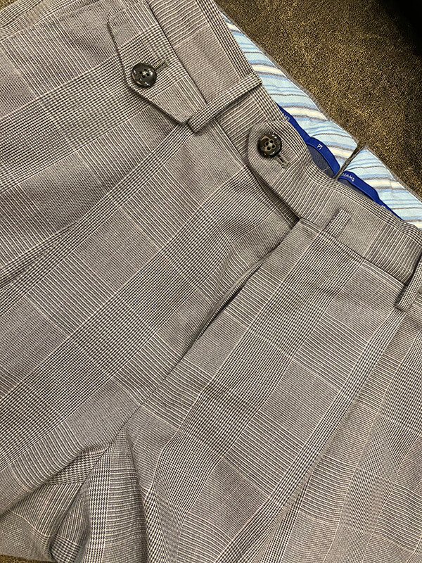 こちらのパンツのような大柄(太目のストライプ、ウィンドーペンなど)の柄が似合いますよ。
