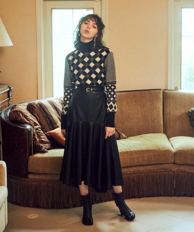 ハイネックリブニットは、裾のペプラムにあしらったラインやシアーなラメ糸が繊細なアイテム。