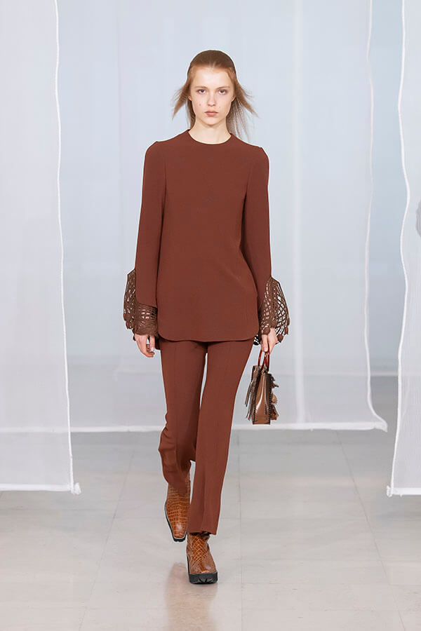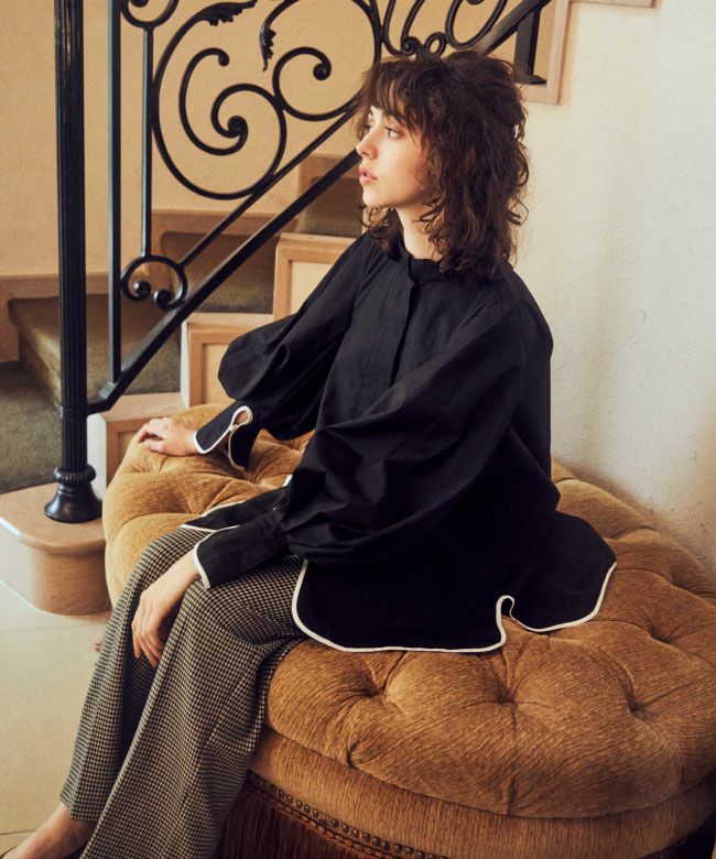 ボリューミーな袖デザインが印象的なブラウスと、コード刺繍のベストのレイヤードは、今季のテーマを象徴するようなスタイリング。