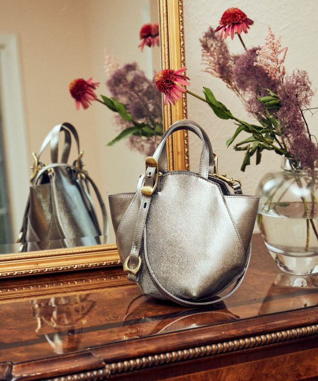 サークル状のハンドルあしらったコンパクトサイズでありながら、まるでガラス細工のように繊細なパーツのカッティングが華やかなバッグ。