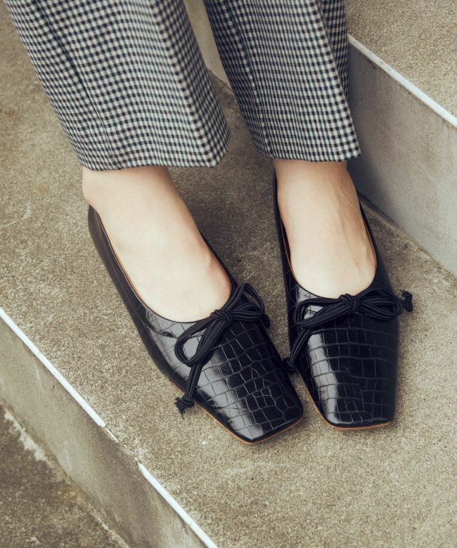 クロコ型押しのレザーが高級感がありながらも、フラットで履き心地も良くデイリーに取り入れやすいデザインです。