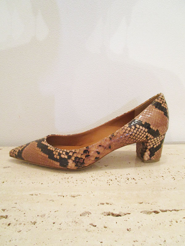 定番人気のポインテッドパンプスは、パイソン柄でもオレンジブラウンの絶妙なカラーが他にはない逸品。