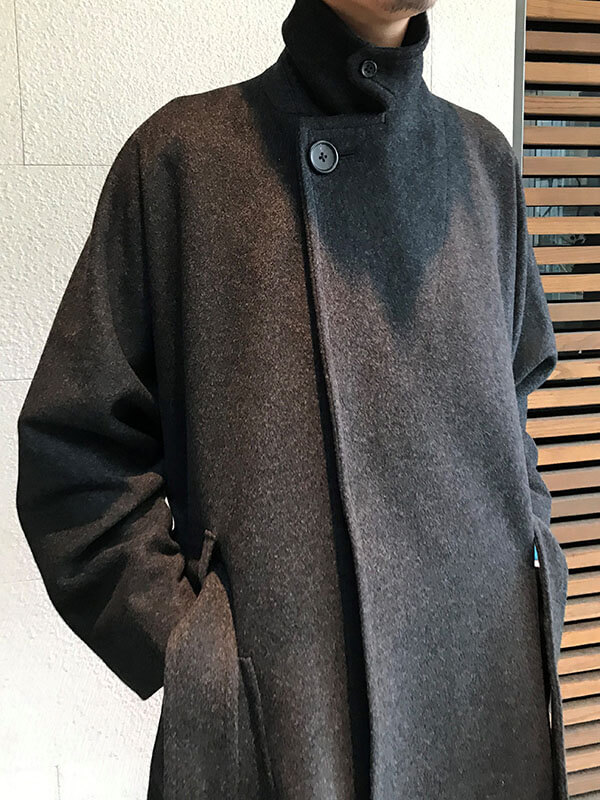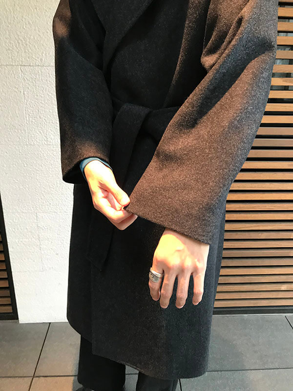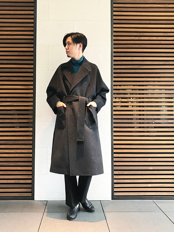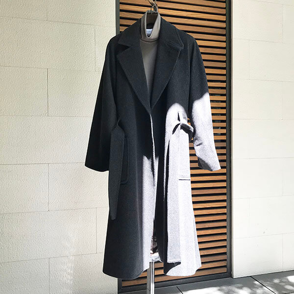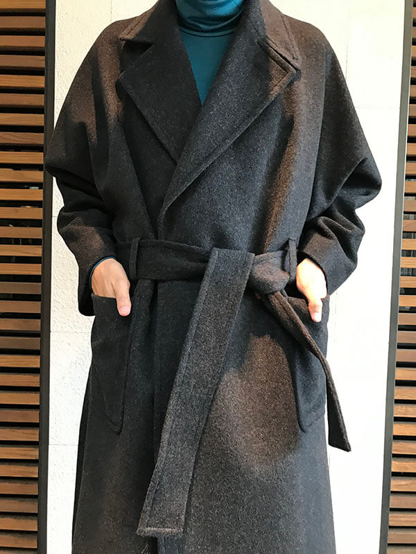 ドレープ性のあるコートなで、ベルトを締めることでナチュラルなAラインのシルエットに仕上げています。