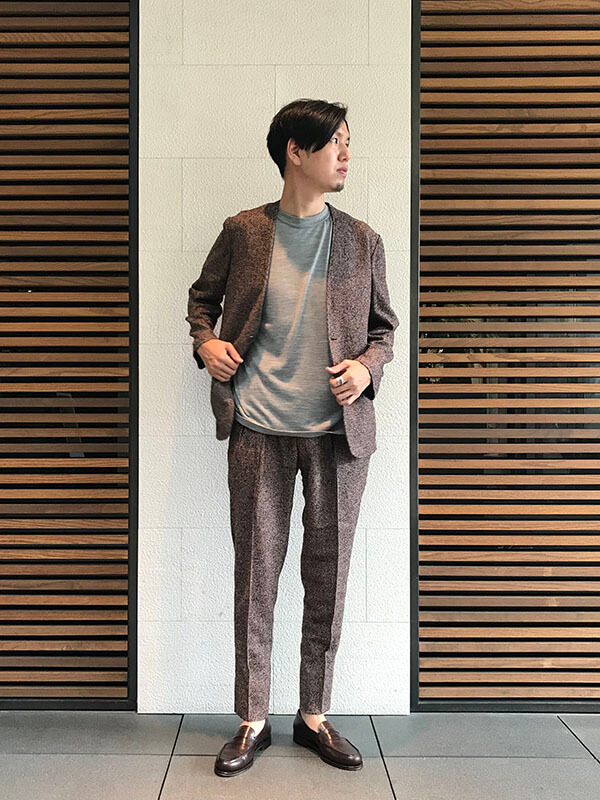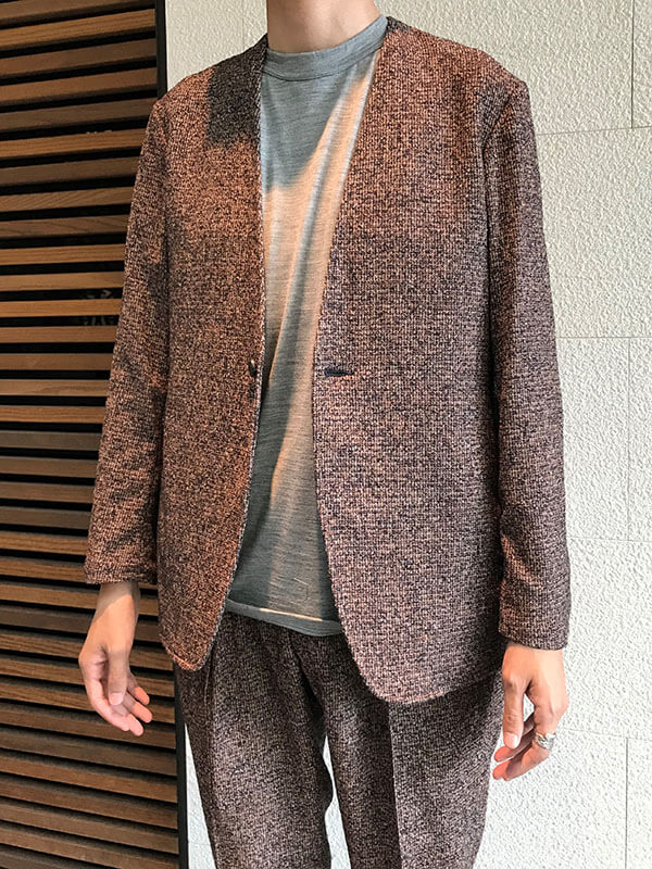 ノーカラーのジャケットとツィード素材のカジュアル感がセットアップを良い意味でラフな印象に仕上げています。