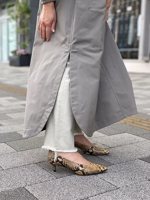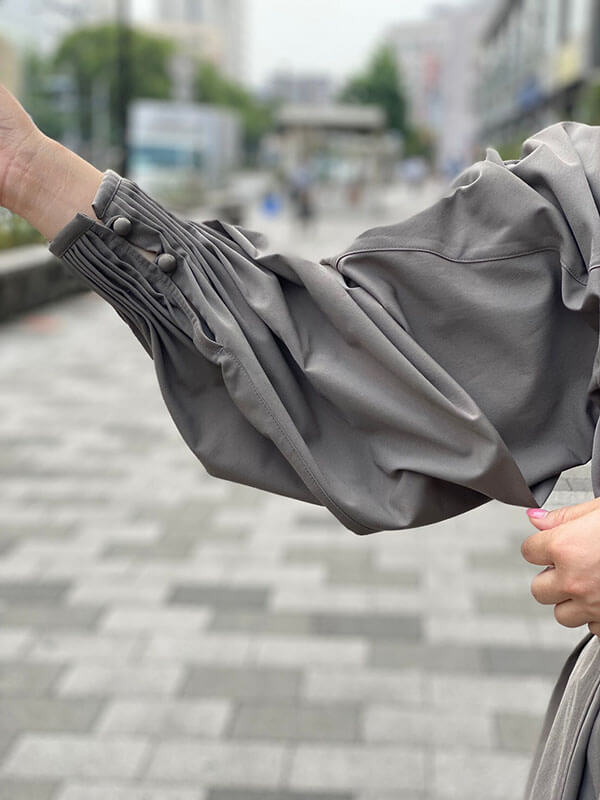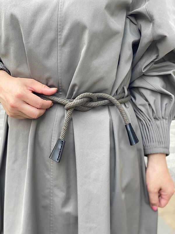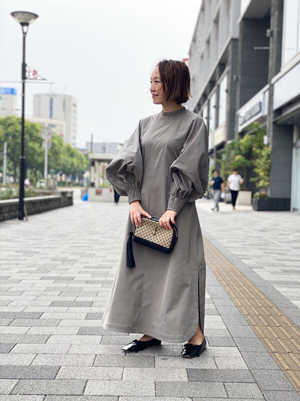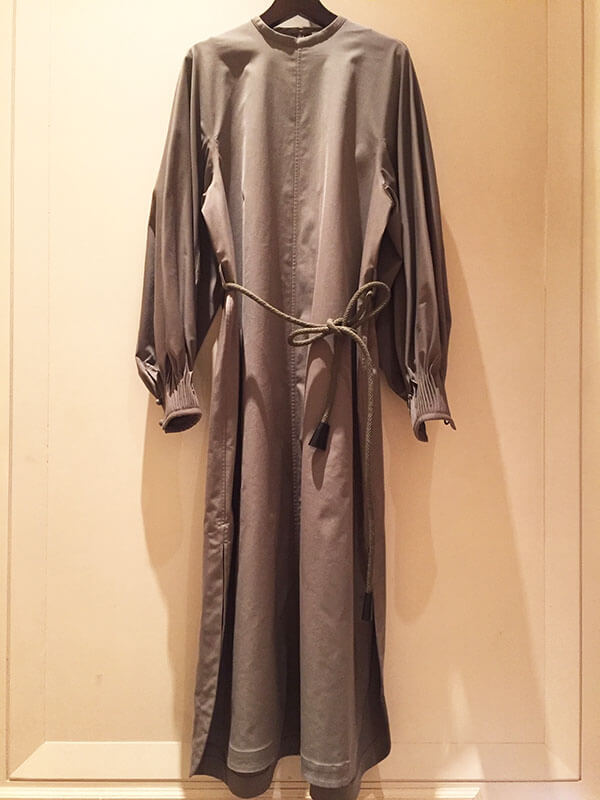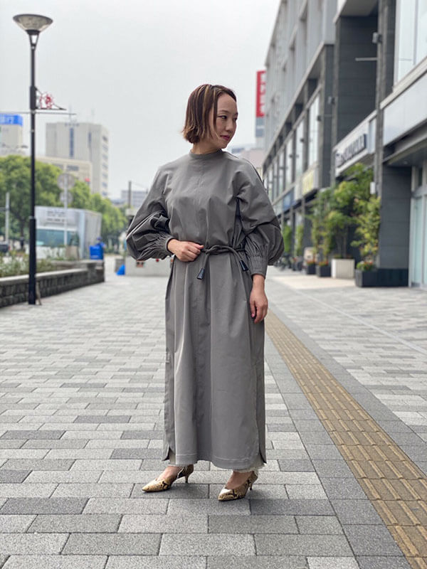 私はミルキーカーキと呼んでいますが、グレーがかったカーキが何とも言えないクールなワンピースです。