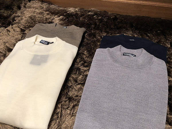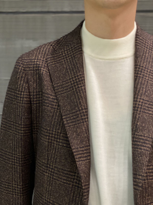今季も引き続きクルーネックとタートルネックの中間のモックネックがオススメです。アレサンドロルッピの首回りをスッキリ見せながら、ジャケットの襟と素肌が接着するのを防いでくれます。