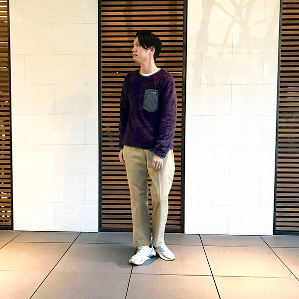 フリース素材で尚且つパープルという色味ですが、素材感で柔らかい印象とベージュのパンツでバランスをとっています。