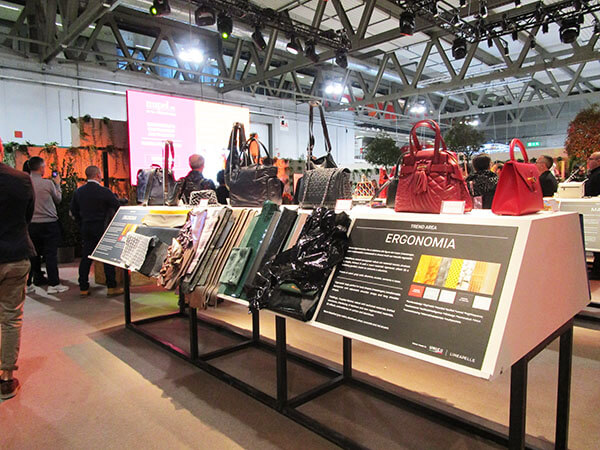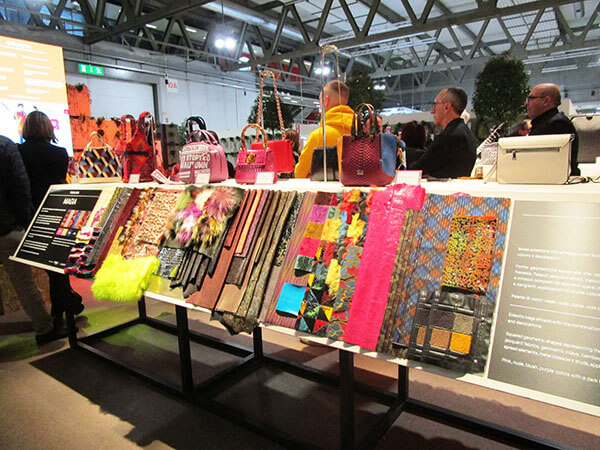 トレンドの素材や、カラーについての展示もされていて、やはりイタリアのレザーはカラーも素材も豊富で見ごたえあります。