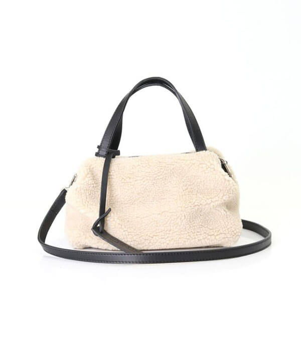 ボアとレザーのコンビネーションのバックはショルダー付きで持ち易いのと、カジュアルな中に洗練された雰囲気を醸し出します。